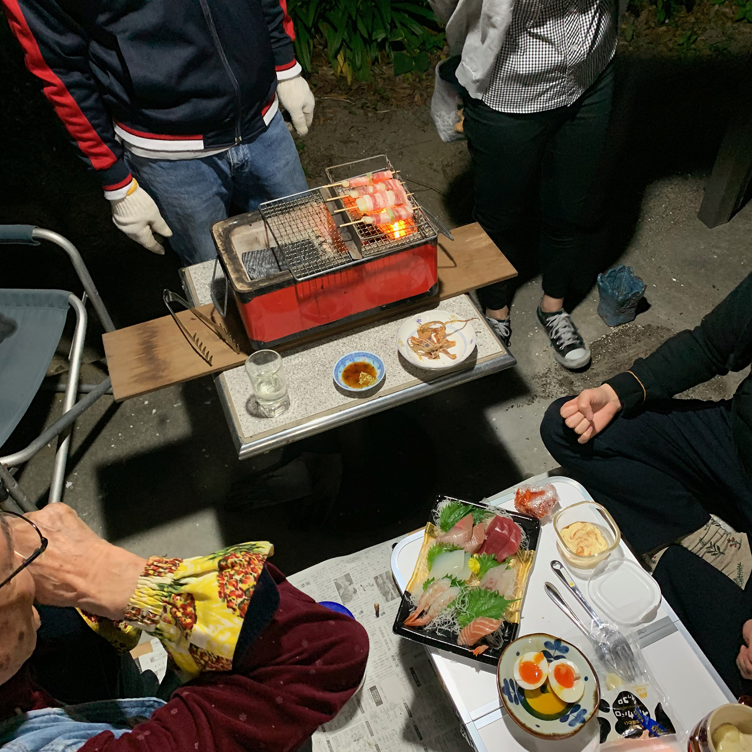 お庭でお酒のつまみを炭火で焼きながら。